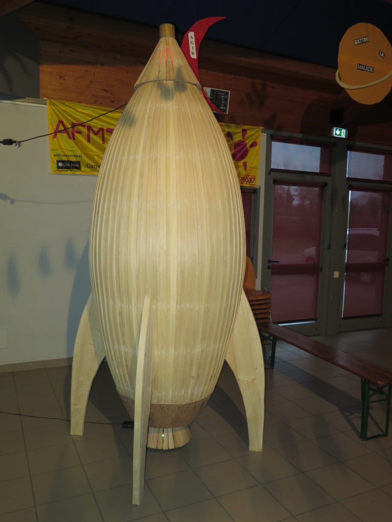 Mais la reine de la journée aura été sans nul doute la magnifique fusée thème de cette édition, réalisée par Jean Paul et Jean Jean avec ses 2,5 m de haut, entièrement en bois ; elle aura nécessité des dizaines d’heures de travail et pas moins de 1236 vis, sans compter la colle et les pointes…, elle sera vendue aux enchères au profit du Téléthon.
